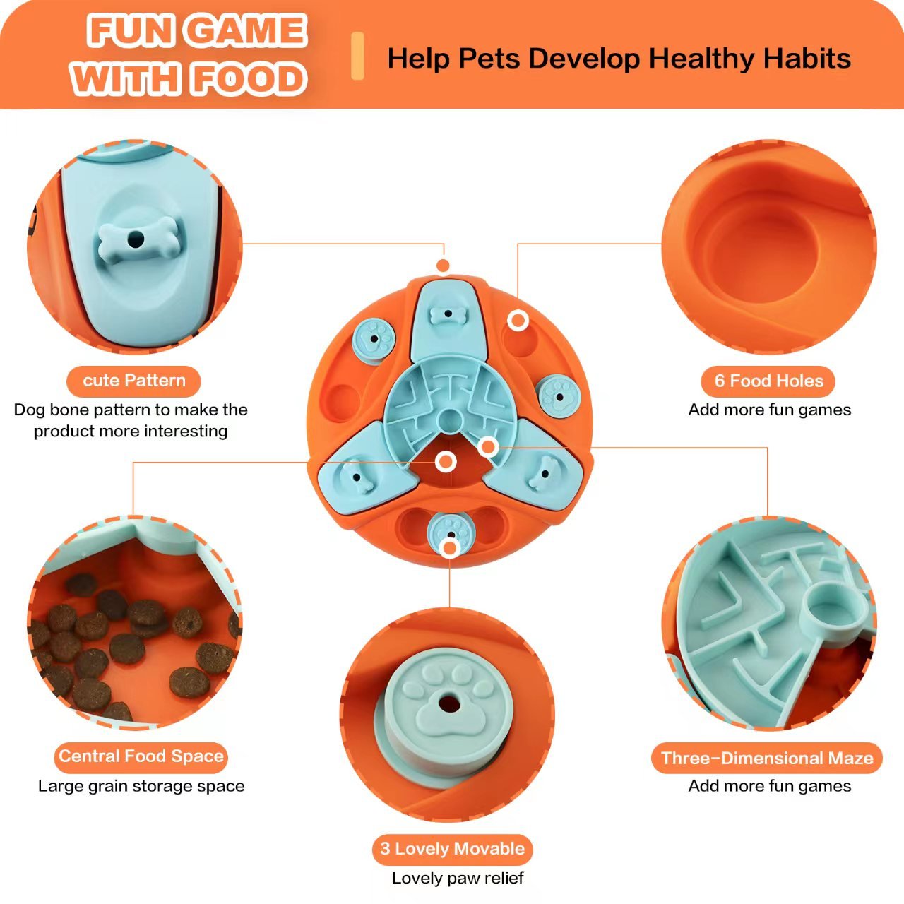 Features different-hole treat dispenser, cute movable buttons and non-slip mat.