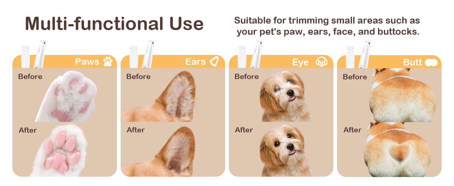 Suitable for trimming small areas such as your pet’s paw, ears, face and buttocks.